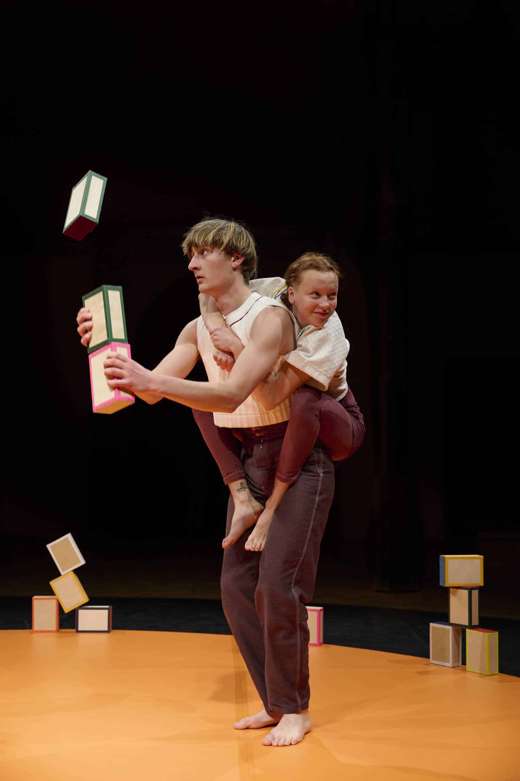 Ici, tout devient matière à exploration : les boîtes bien sûr, mais aussi le sol et le corps de l’autre. Ce duo inventif bâtit et déconstruit dans un même élan joyeux, célébrant la rencontre, la curiosité et l’imagination en mouvement.