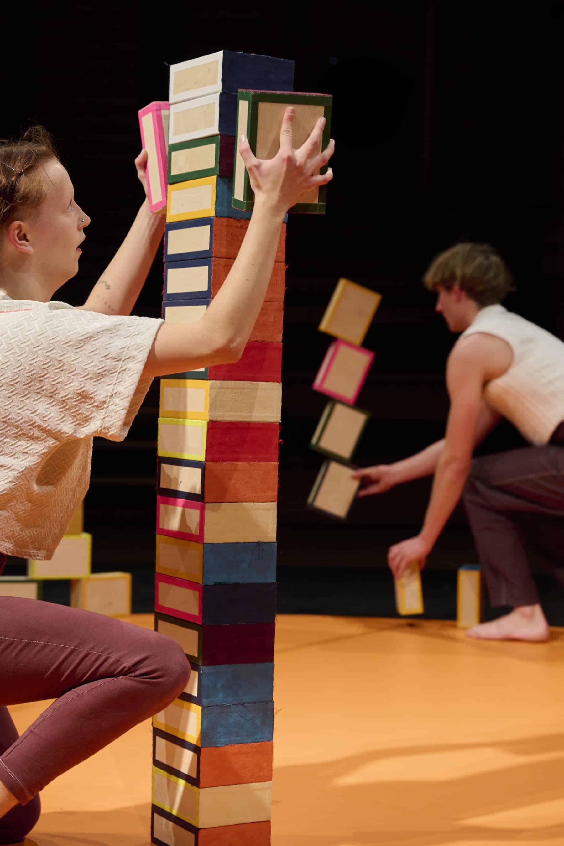 Au centre d’un cercle, un garçon calme et une fille énergique s’observent, se défient, puis se lancent sans un mot dans un jeu acrobatique avec une ribambelle de boîtes qu’ils explorent et empilent, construisant des villes et des châteaux pour les renverser aussitôt.