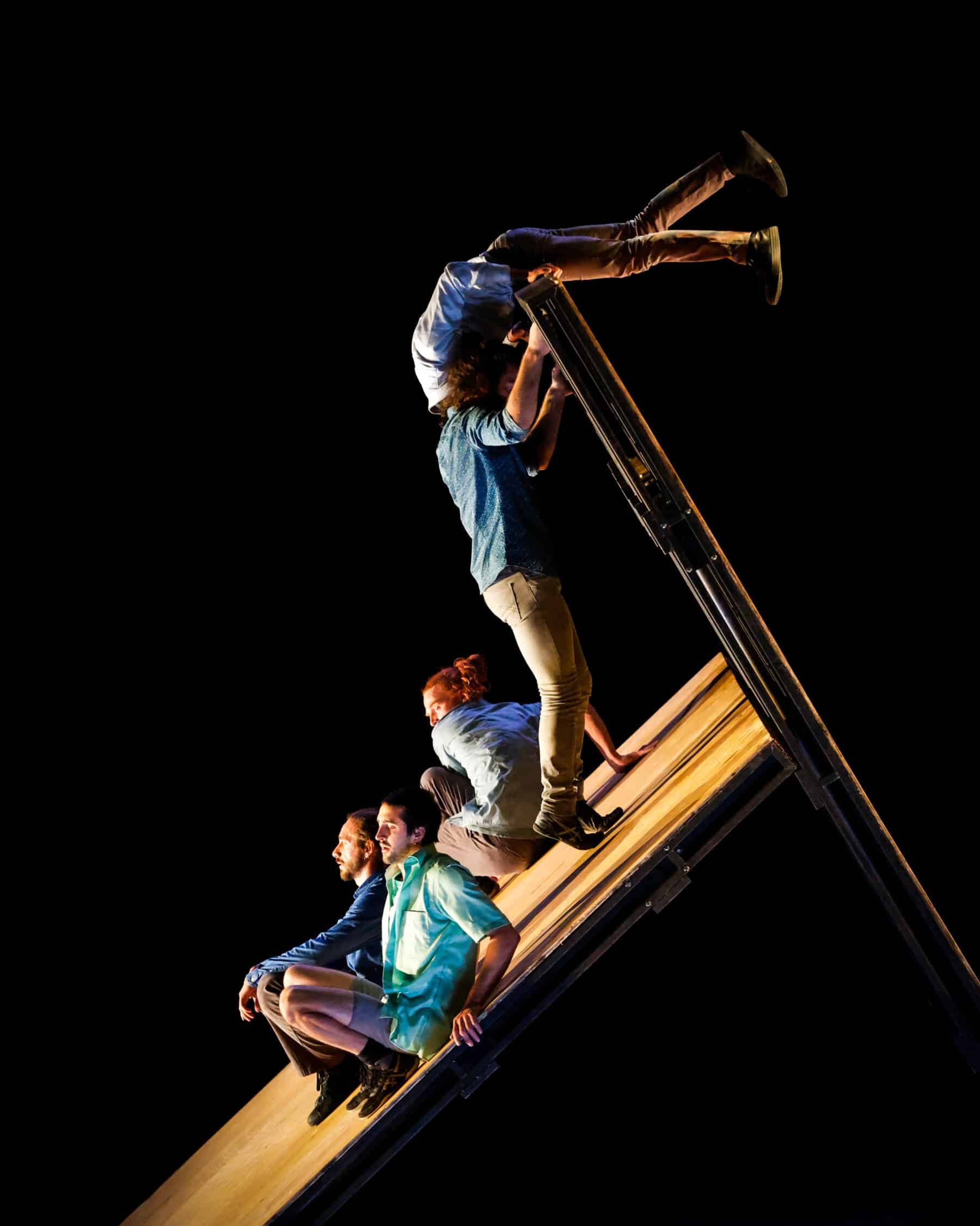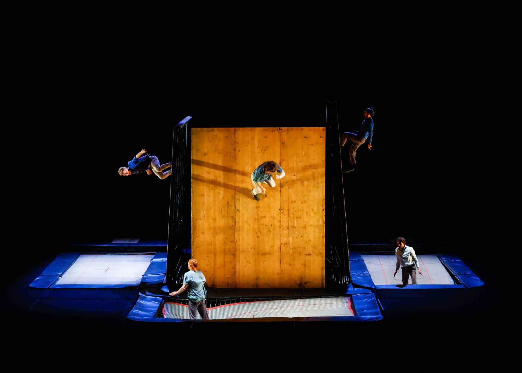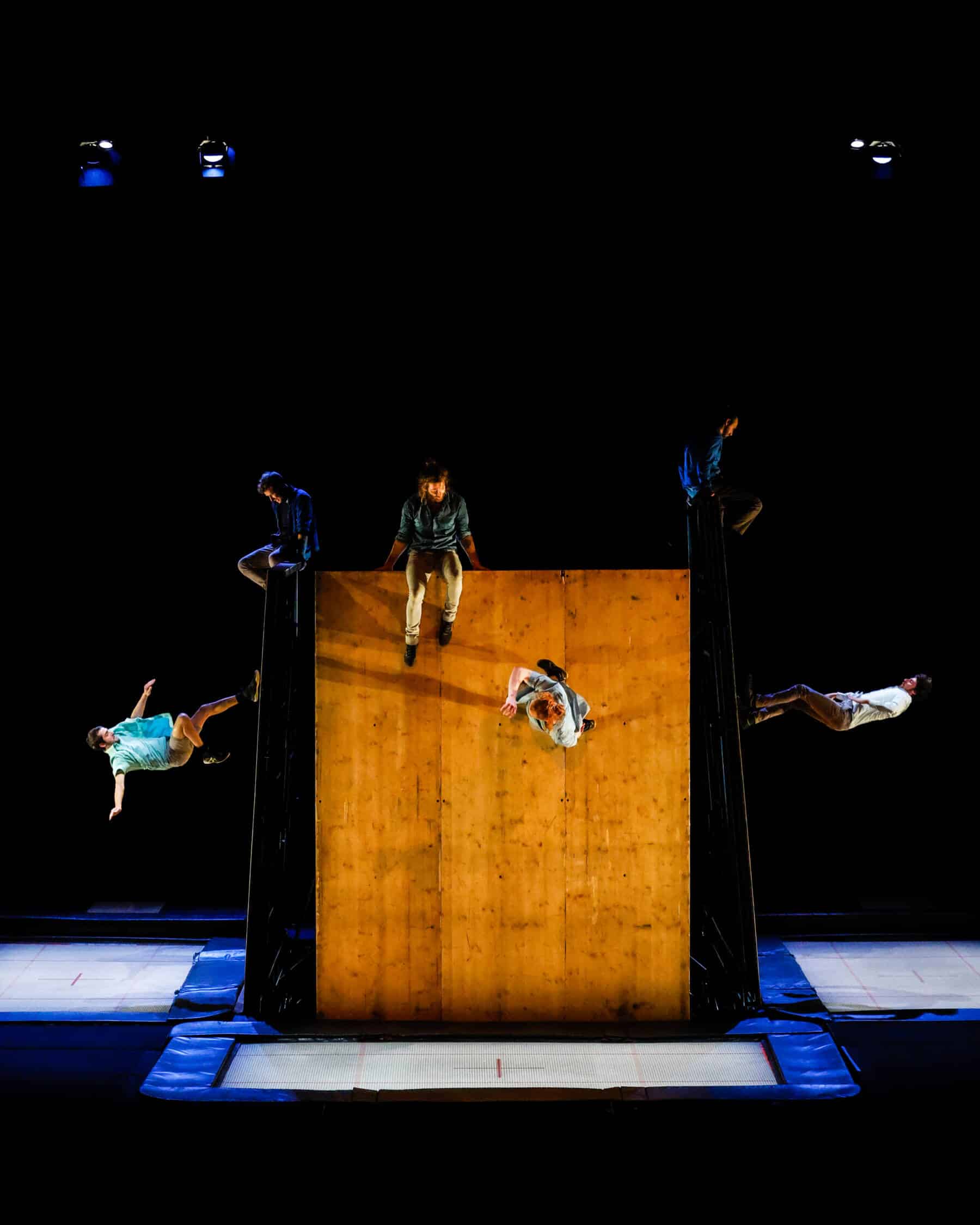 Pour rendre hommage à cet agrès qu’il pratique depuis vingt-cinq ans, Gaëtan Levêque a imaginé une structure faite de trois grands trampolines entourés d’un plateau et de plans inclinables qui permettent de multiples variations. En glissant, rebondissant, s’abandonnant, se croisant, les interprètes questionnent la gravité, le poids, la suspension, et nous plongent dans une dimension où les codes et les repères spatiaux sont totalement abolis.