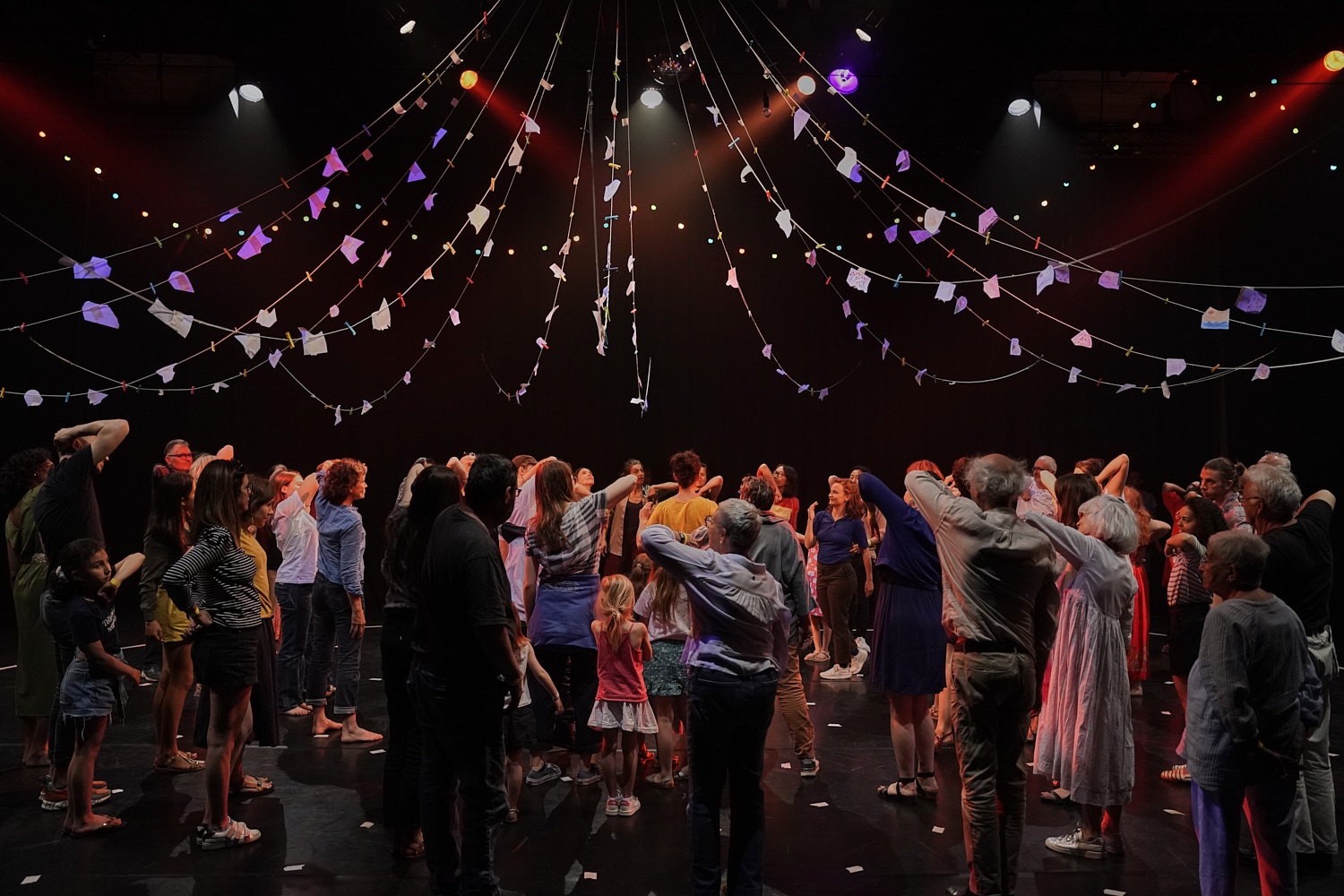 Dans un élan de joie partagée, les danseurs invitent les jeunes spectateurs et leurs parents à les rejoindre sur la piste, guidant les corps avec douceur. Petit à petit, l’espace se remplit de mouvements, de sourires et de dessins imaginés par les spectateurs. Le seul mot d’ordre : se laisser aller à la fête !
