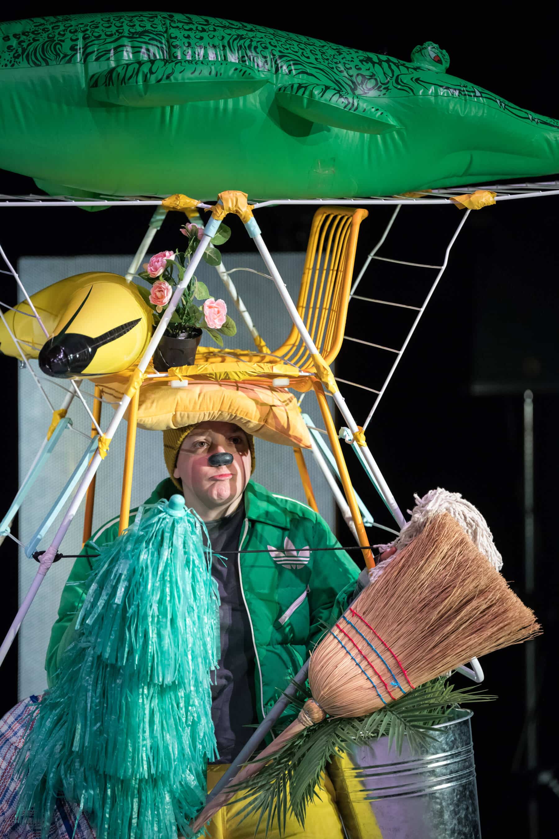 Seule dans sa chambre avec pour compagnie ses objets familiers, une clown-comédienne engage un dialogue avec des voix enregistrées entreprenant, par le rire et l’imaginaire, de réparer les blessures du quotidien, les liens abîmés et les relations conflictuelles.