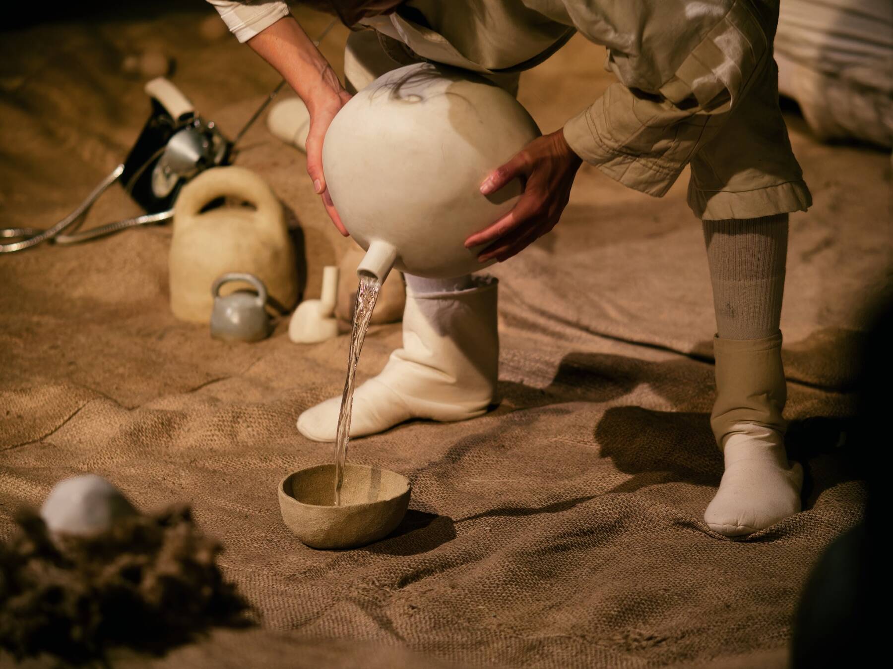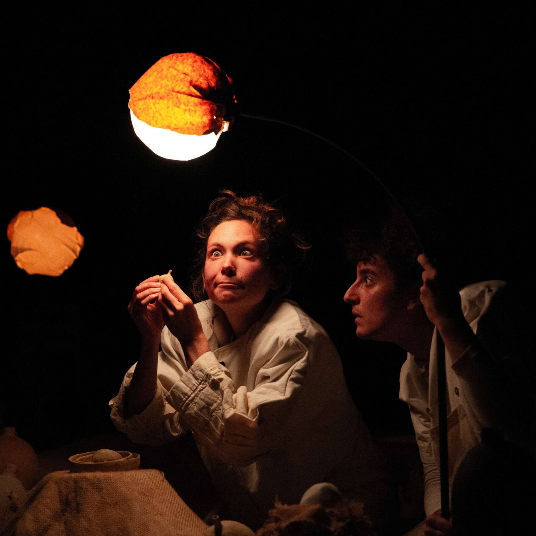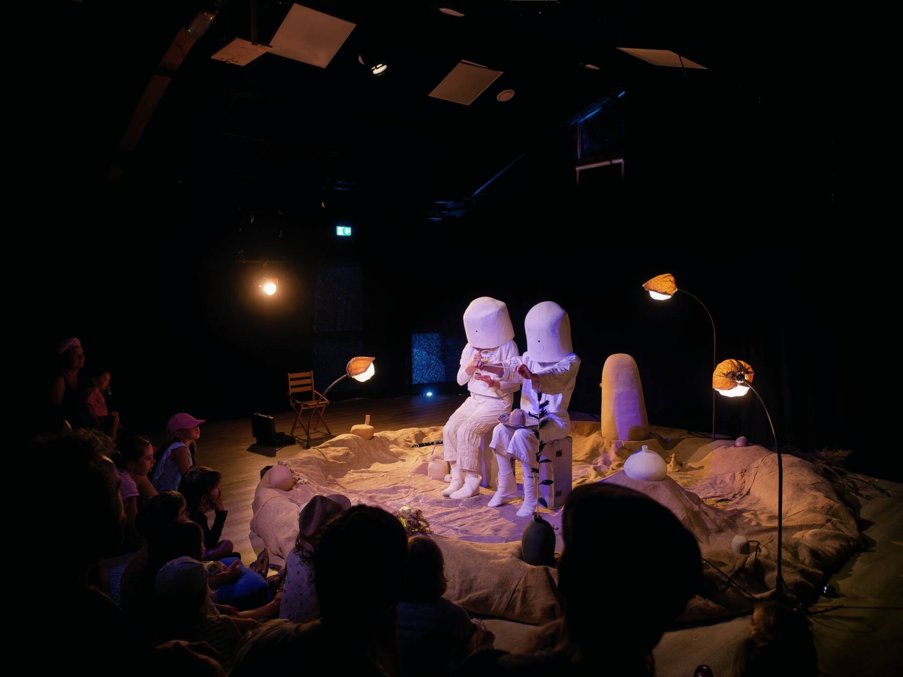 Dans une lumière feutrée, une planète silencieuse s’éveille, tandis que deux étranges cosmonautes y atterrissent pour la première fois. Curieuses de comprendre où elles sont, elles appréhendent par le son et le toucher les mystérieux objets qui jonchent le sol de cet astre. Qu’ont-ils à raconter ?