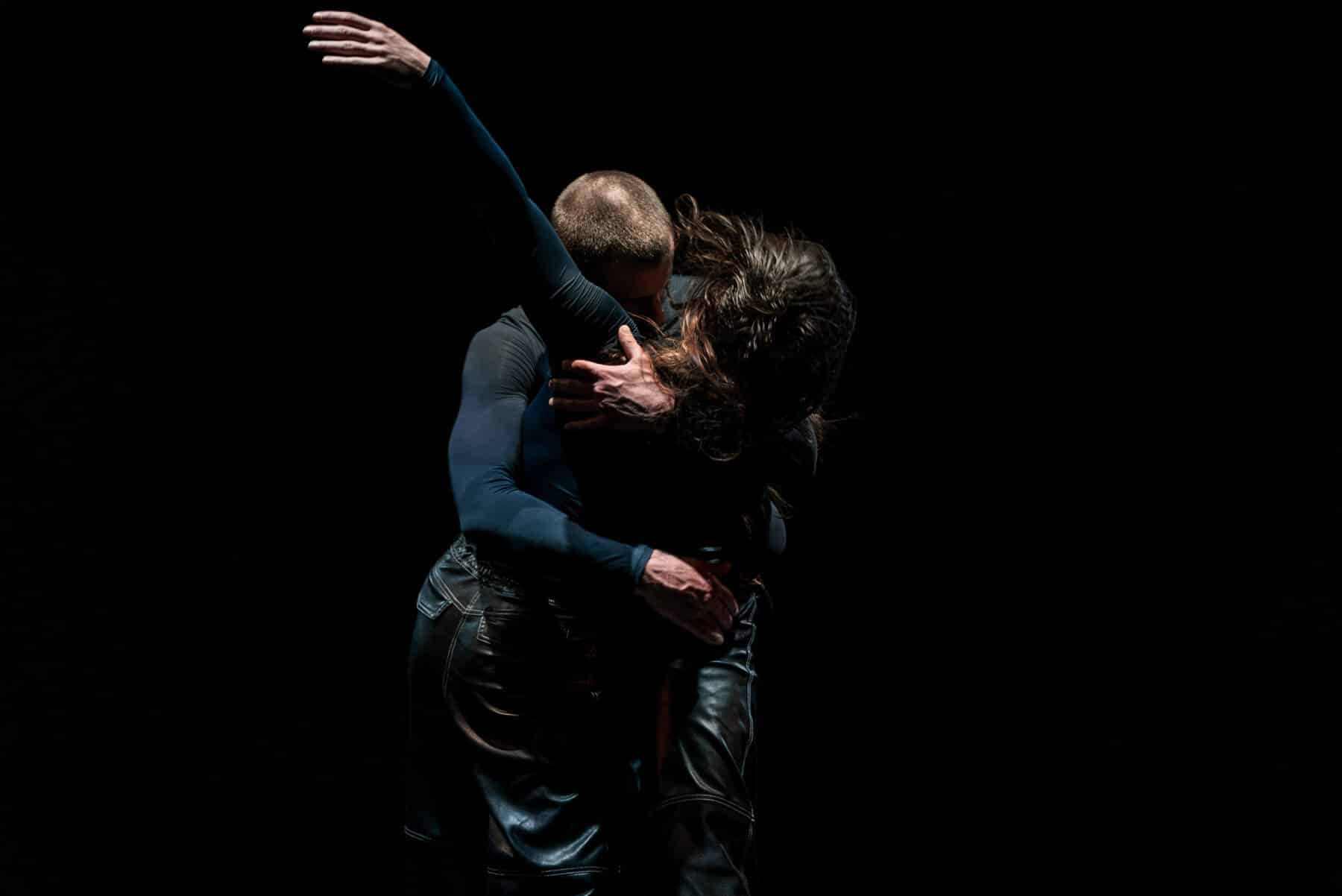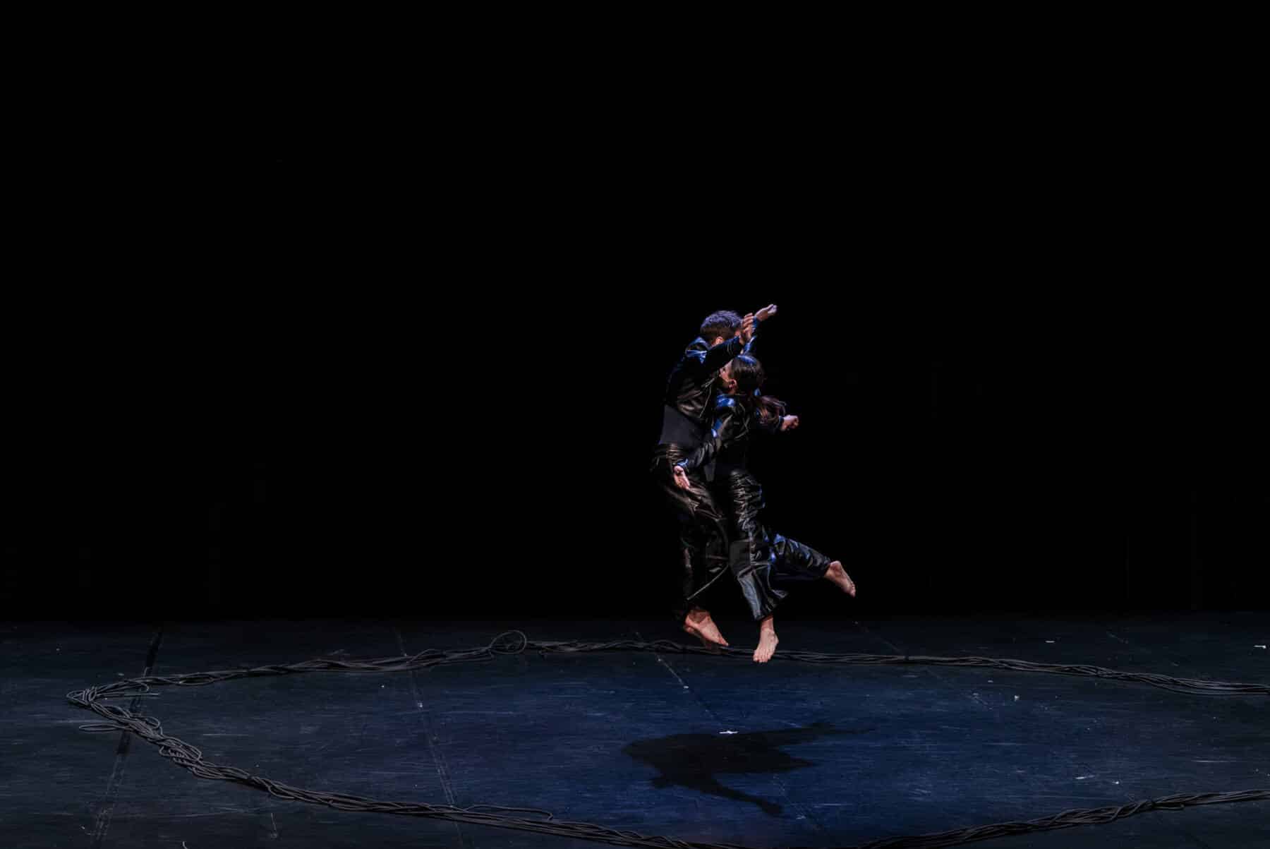 Dans Viscum, les voilà comme deux félins dans une arène de câbles noirs, deux individus gainés de cuir noir qui se flairent, s’approchent, se heurtent et même s’entrechoquent en se jetant l’un contre l’autre dans un mouvement répété, puissant et fascinant, laissant libre cours à l’énergie brute qui les anime. Si cette pièce nous parle de l’intensité de la rencontre, elle aborde aussi le consentement et la juste distance entre deux corps. Ici, un micro sur pied sert parfois de médiateur pour cheminer l’un vers l’autre. Présent au bord du plateau, un musicien électro développe en direct le paysage sonore texturé, organique, qui accompagne cette danse-combat.